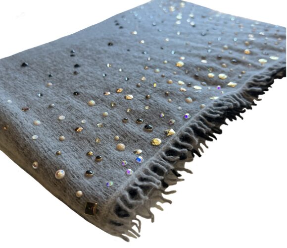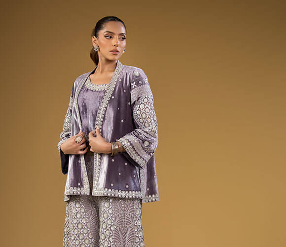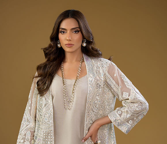 Original price was: ₨188,000.₨178,000Current price is: ₨178,000.Oyster Grey Net Jacket With Flared Pants