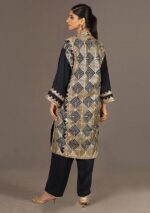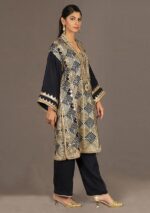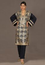 This zardozi black embroidered outfit is a 2 piece paired with raw silk pants.