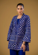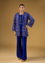 This Regal Blue Sequins & Beads embroidered Net Jacket set is a 3 piece outfit paired with regal blue raw silk flared pants.