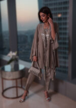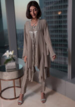 The grey long tassels outfit is a 3 piece. Top is made of pure georgette paired with a silk camisole and rawsilk pant.